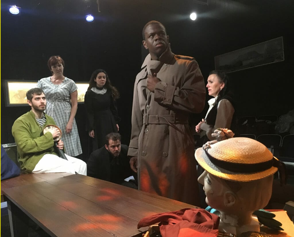 This physicality and expressiveness of this cast of ten (Dennis Bisto, Abby Blankenship, Marzena Bukowska, Holly Cerney, Sami Ismat, Emily Lotspeich, Joan Nahid, Zachary Nichol, Keith Surney, and Bob Wilson) under the superb direction of Catherine Sullivan IS what gives THE LOCKETEER its considerable draw. They each move from role to role and back and forth to ensemble with little more than a swap of kerchief for hat— often using just their voice and posture to be a boy or man, as the dialogue requires. When they are in the backdrop of the action, with eye rolls or bulges, or pouts or grimaces they become a sort of Greek Chorus, telegraphing the content of upstage lines.