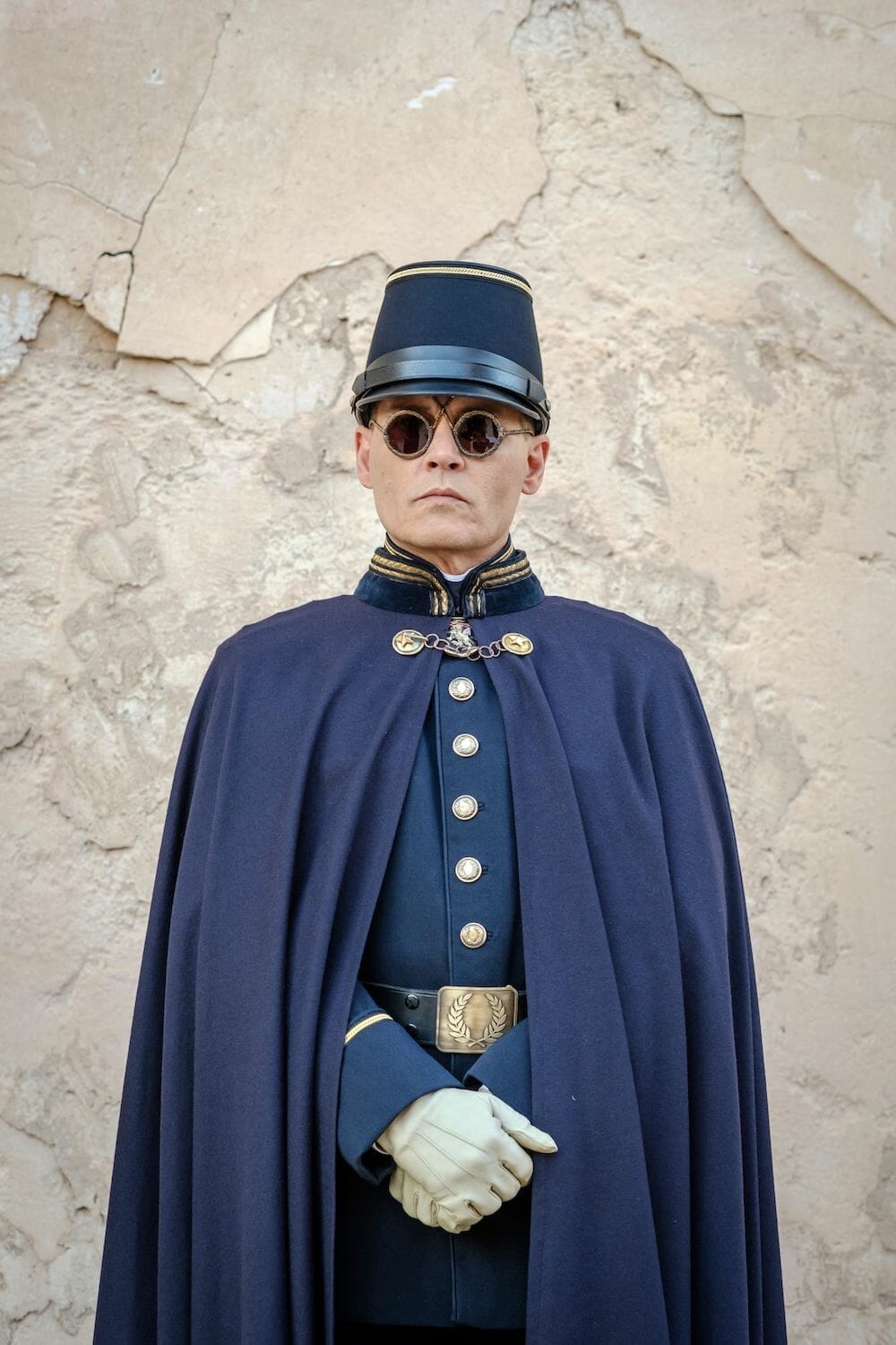 Unbeknownst to the restful settlement, a dark presence is quickly descending upon them. A pale, pox marked Colonel Joll, played by Johnny Depp, has traveled great lengths from the outpost’s distant imperial headquarters. Dressed pristinely in midnight blue and gold regalia, a sweeping cape and dark glasses, we see the Colonel’s attention mainly on the superficial manners of a civilized meal – that is, when he isn’t incarcerating nomads and directing their abuse. He hides his eyes behind opaque and outlandish glasses; the bronze frames of the black lenses meeting between his eyebrows and extending an X between his eyebrows. In more ways than one, Depp, his dark-suited men, umber carriage and chestnut Arabian horses all stand in intolerable contrast to the steppe, Rylance, and his men.
