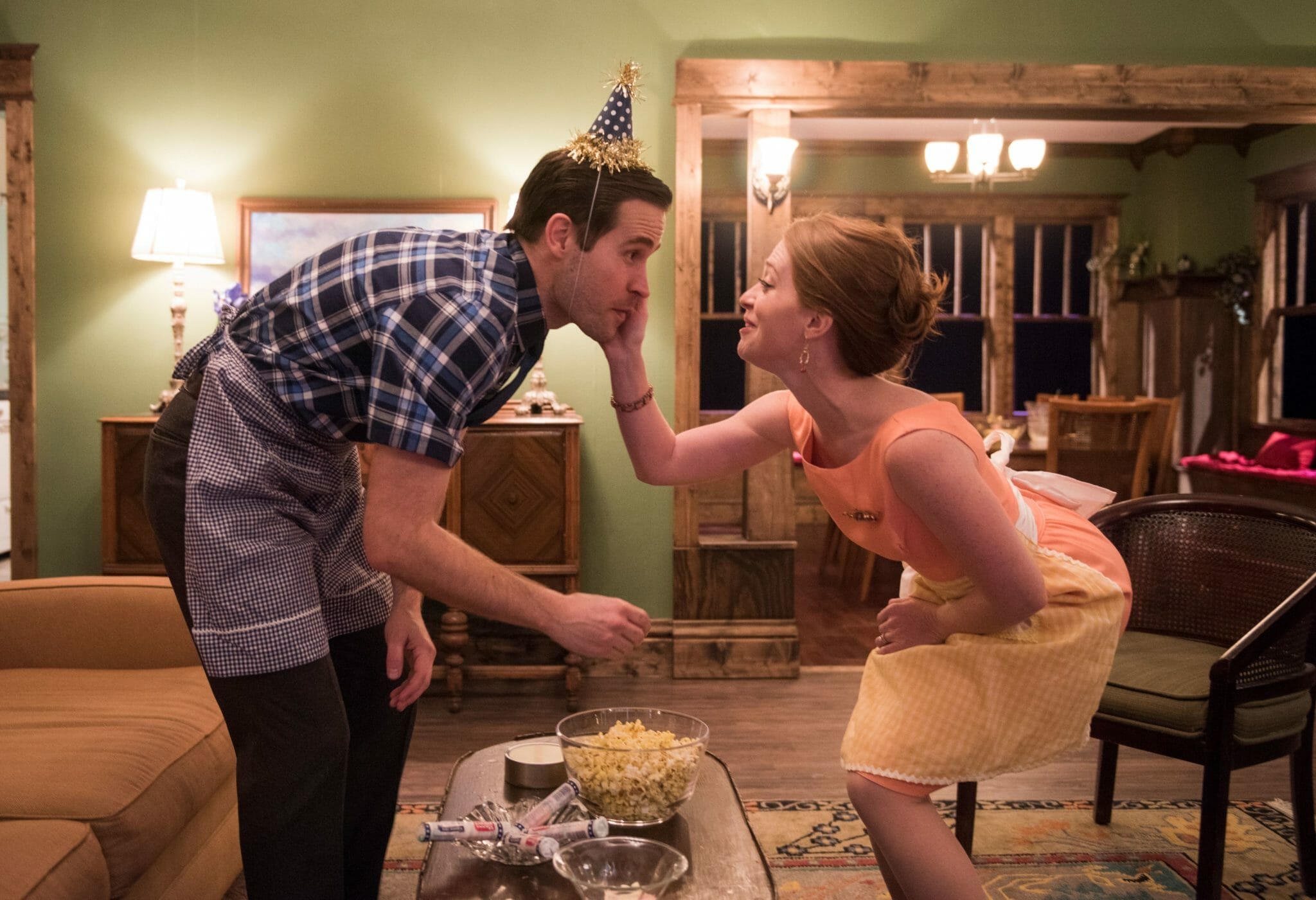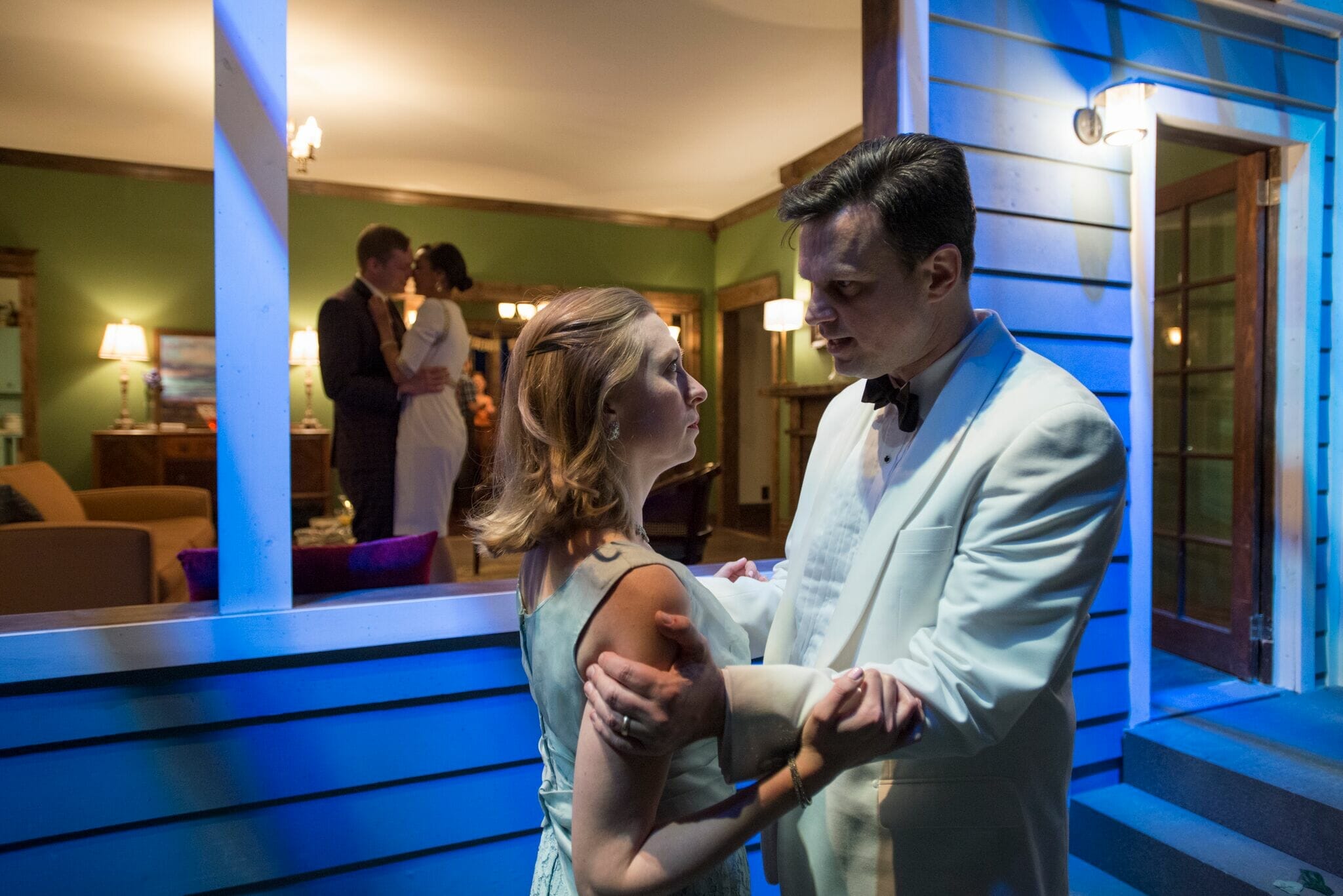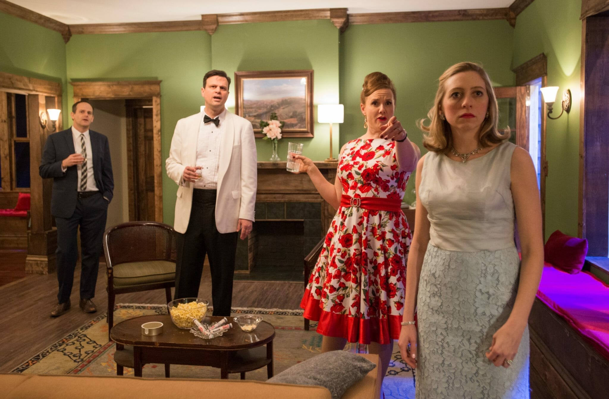 By the house’s décor, we are in the 1960s, and we later learn the setting is Georgia. The resident couple are Beau (Michael McKeogh) and Ellie (Sarah Grant). She comes from money; his recovery from alcoholism is an on-going process, and there’s tension there. There’s also tension because the catering truck crashed, leaving them with nothing to eat but crackers with spam. But most troubling of all, a large sum of money has gone missing from their company. Today is the fortieth birthday of Ellie’s sister-in-law, Suzanne (Brianna Borger), and they’re celebrating for the sake of Ellie’s brother, Jackson (Paul Fagen), who is also Beau’s business partner. Suzanne is known for her cutting remarks and not being the kind of person to take turning forty well, but Jackson’s still cool. They hope.