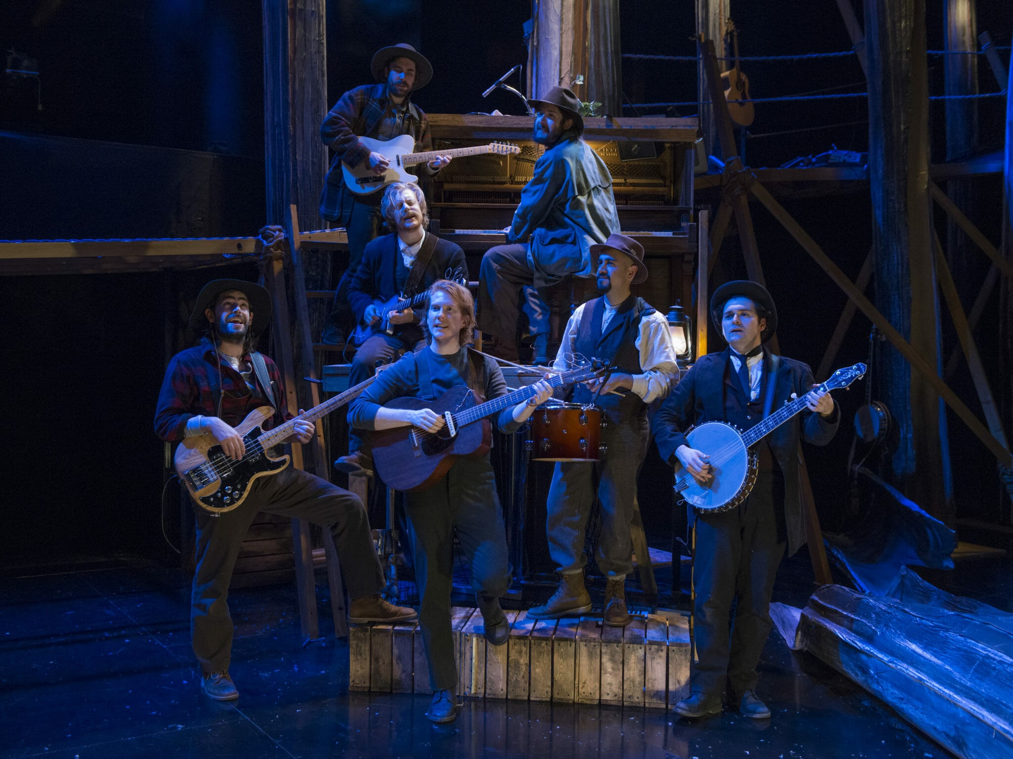 It’s likely only at the final bows when you will truly register the impact of PigPen Theatre’s production of THE HUNTER AND THE BEAR at Writers Theatre. It’s then— when you are startled by your eviction from the imaginary world the theater group has immersed you in— that you understand PigPen's theatrical power. For almost two hours, the landscape of the Northwest in the 19th Century has populated your mind and wiped out the realities of the gorgeous new Writers Theatre space that is soon to mark its first year birthday. You get immersed in their tale-- in a thick forest in the Northwest with a ragtag team of loggers aiming to get rich. It’s a place where ghost stories can more than take root, and they do.