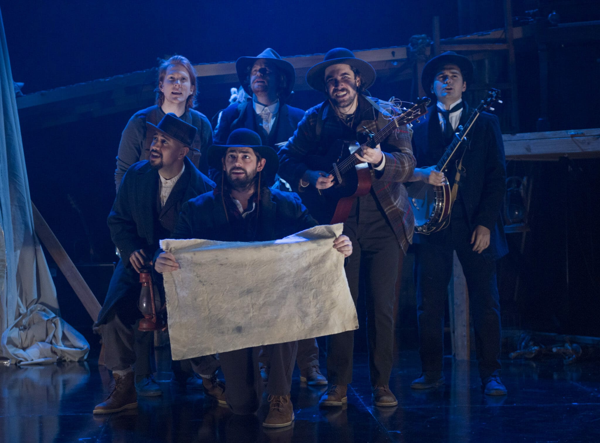 It’s in the low budget stagecraft where PigPen really shines. You can’t help but admire their creativity when the cast is re-creating the sounds of a small crackling campfire, and then the next moment are pounding posts as well as drums to signal the passion of the scene. Their voices are soothing; their lyrics and songs are gripping. Script and acting define distinctive characters and dramatic moments in seconds. The script might be begging for edit, but the creativity at its core re-hooks you repeatedly.