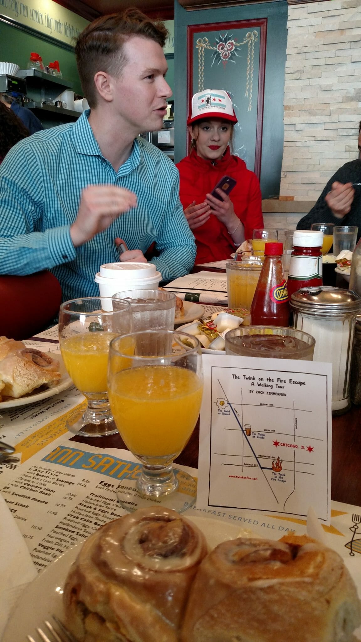 The 60-minute tour begins at the corner of Clark and Belmont where a friendly tour guide named Josie is waiting. She hands out an apt snack for the beginning of the tour - Twinkies. Then the tour departs for the first stop at an “unnamed Swedish restaurant” (read: Anne Sathers) where we’ll meet Zach. Here at this popular brunch spot, Zach is sitting at the table surrounded by plates of cinnamon rolls and mimosas for each of the guests.